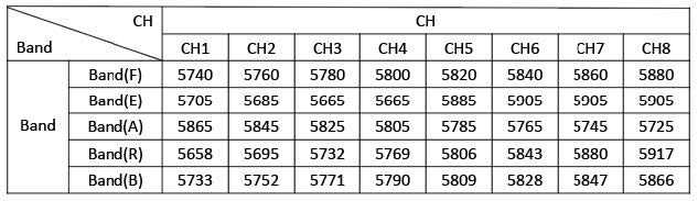 Frequency | 5.8G 5 bands: A, B, E, F, R Broadcast channel: 37 |