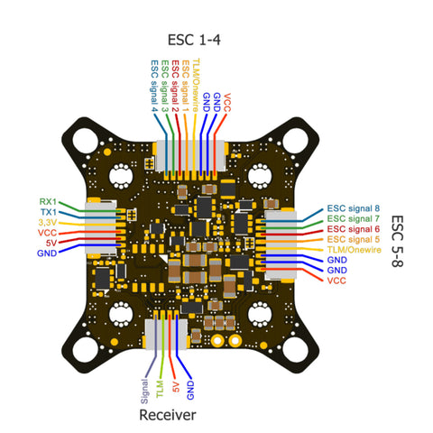 - Connector 1: ESC 1-4 signal, telemetry, VCC, GND