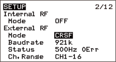 Nel sistema EdgeTX, accedere a MODEL SEL e accedere al menu SETUP. Disabilitare RF interna (impostare su OFF), abilitare RF esterna e impostare la modalità di uscita su CRSF, come mostrato nell'immagine seguente.