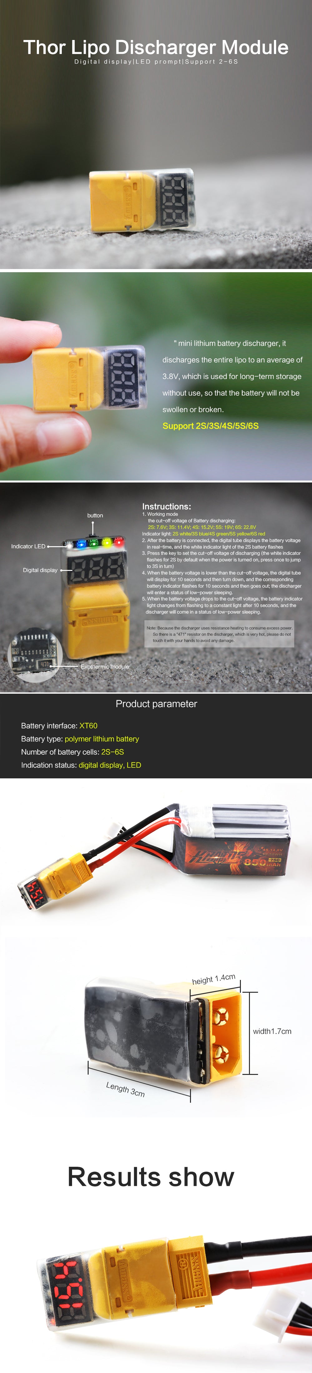 Scaricatore di batteria HGLRC Thor Lipo per aereo FPV Drone RC, il modulo di scarica Lipo supporta lo scaricatore di batteria 2S-6S Nome del prodotto: Scaricatore di batteria HGLRC Thor Lipo Tensione di ingresso: 2-6s Tensione di interruzione a chip singolo discarica: 3,8 V Tipo di batteria: Batteria LiPo Interfaccia batteria: XT60 Display: tubo digitale a LED Dimensioni: 30,2 * 17,1 * 13,9 mm Peso: 8,2 g Il pacchetto include 1x HGLRC Thor Lipo